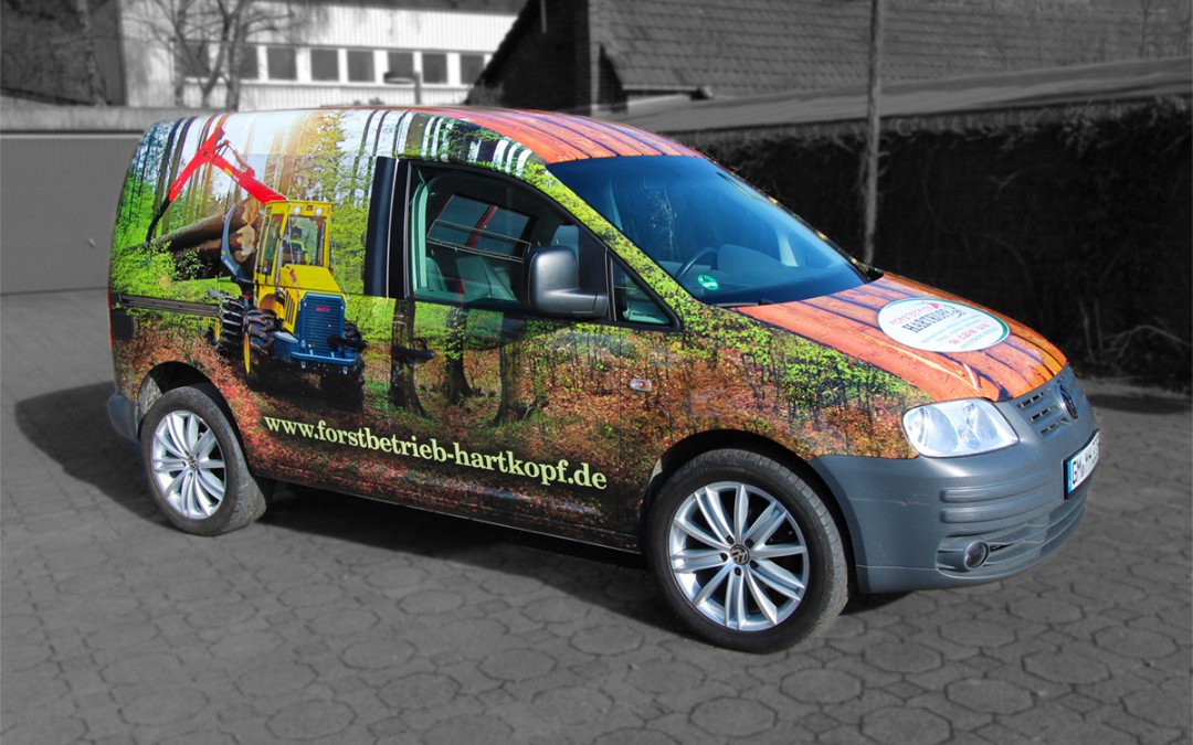 Design und Vollflächenfolierung von KWOM für den Forstbetrieb Hartkopf.